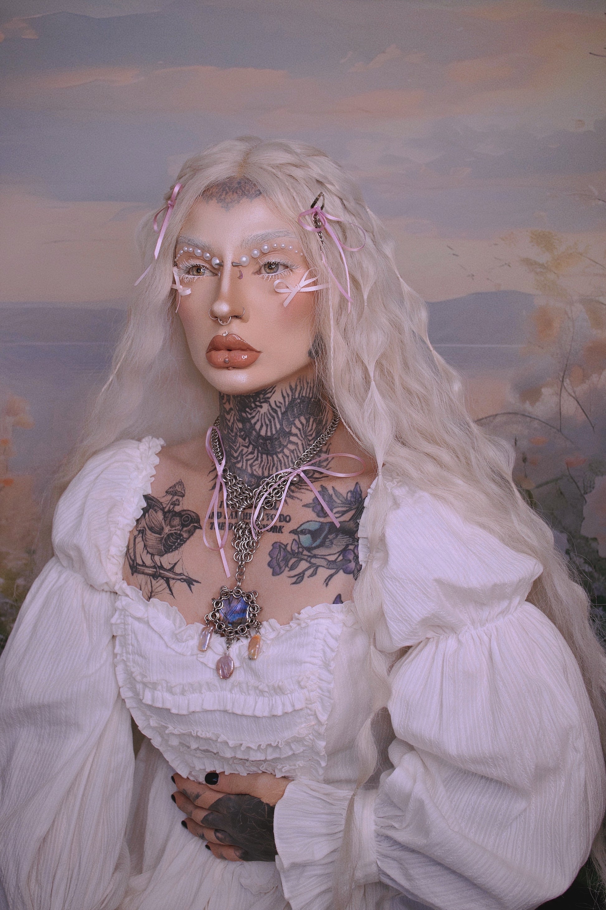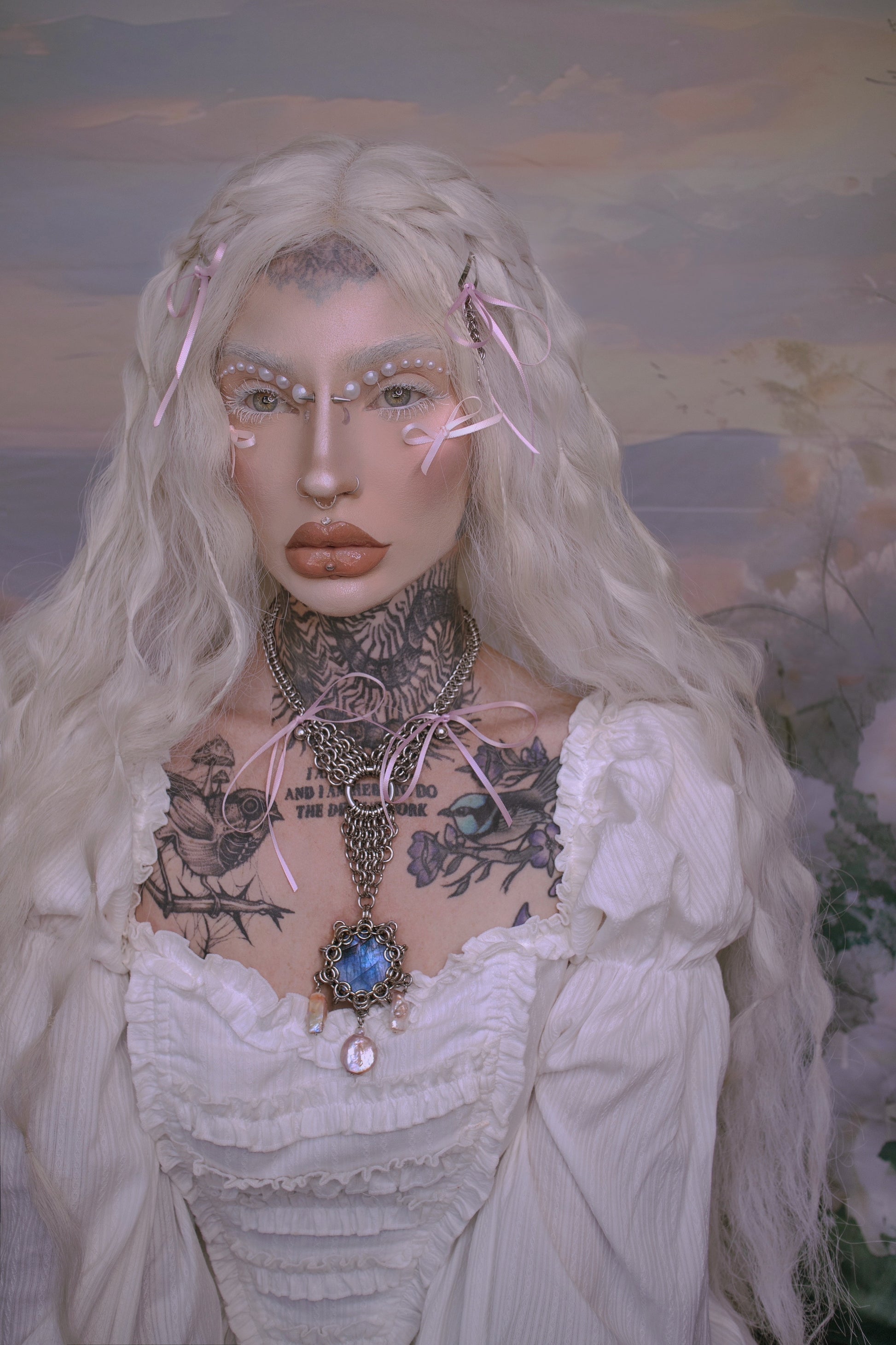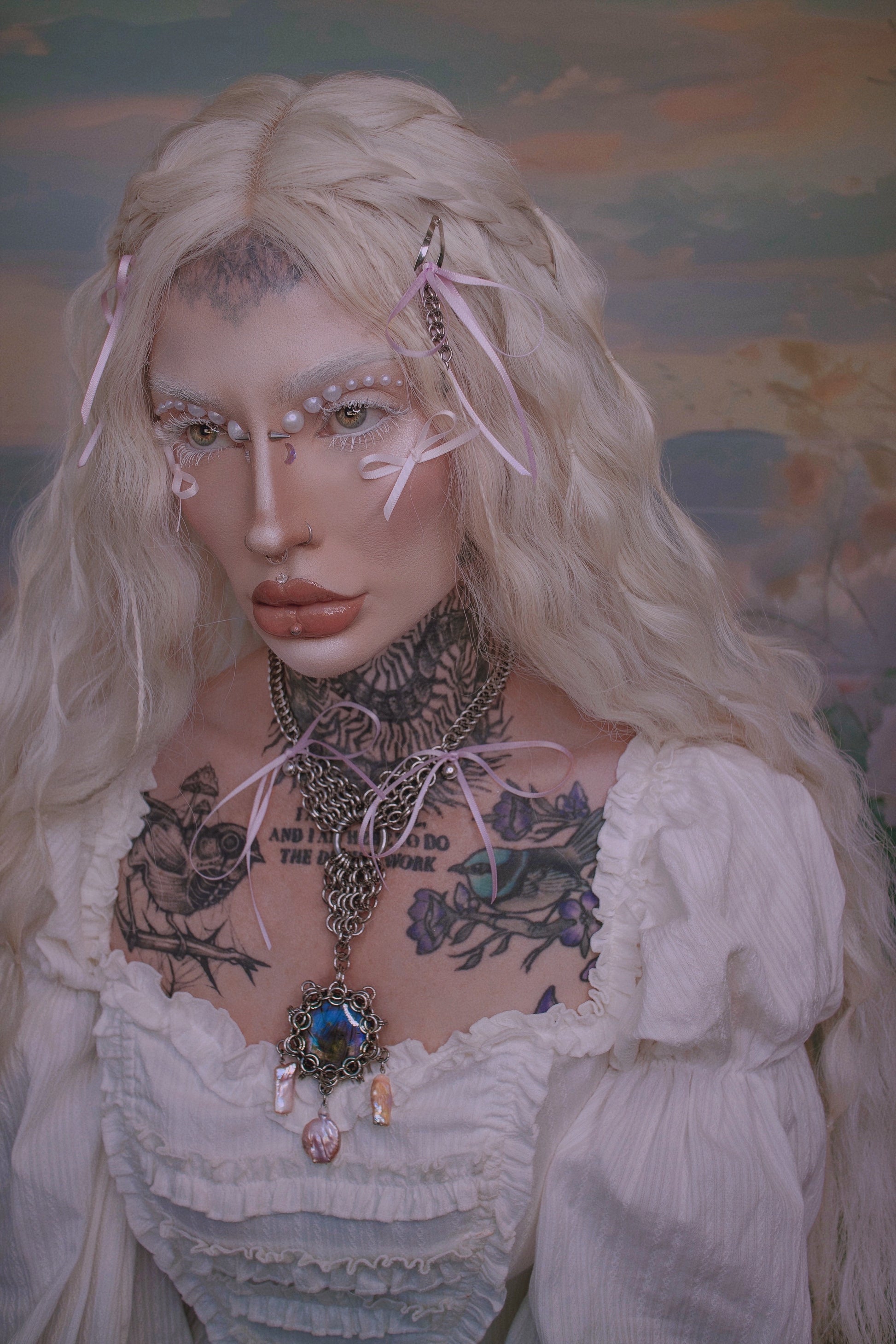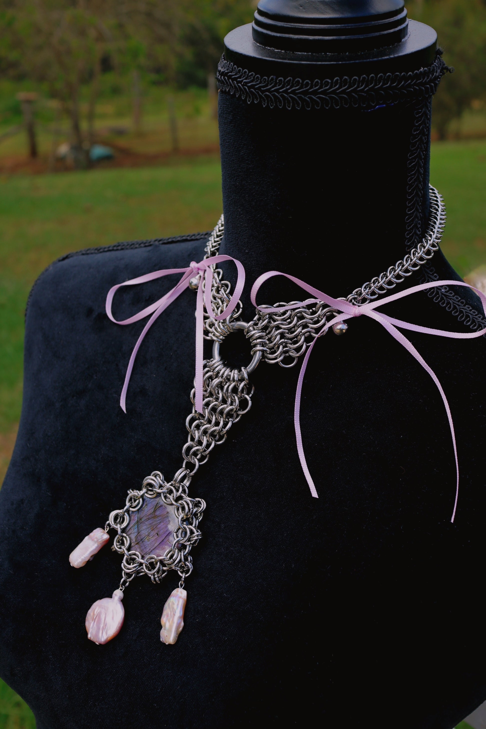 Features a beautiful bright Purple Labradorite, elegantly wrapped in chainmaille and dripped with real lilac freshwater pearls.