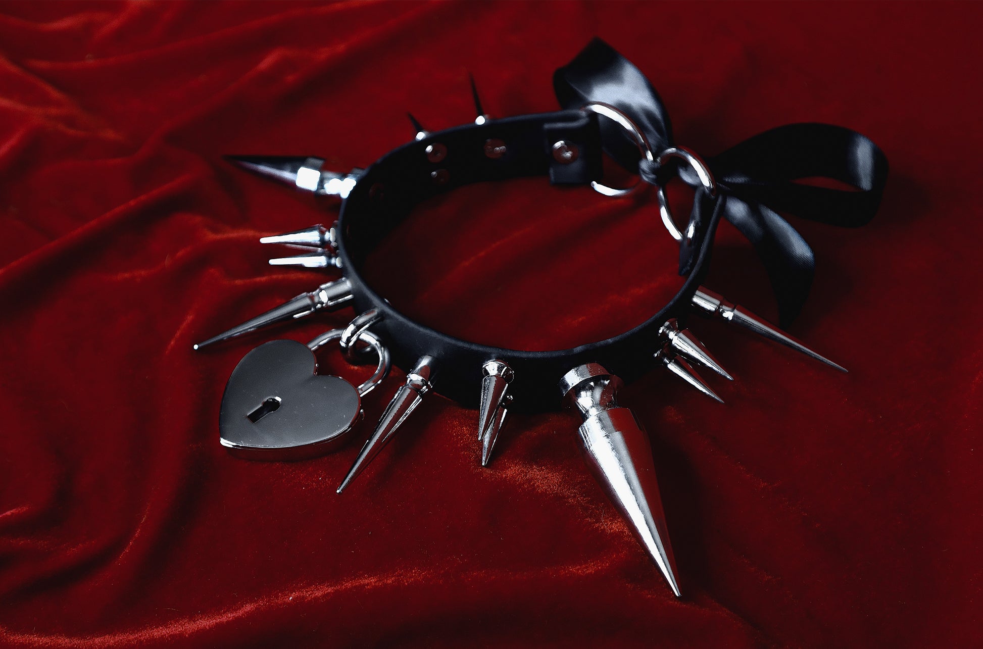 Handmade with durable, vegan Biothane leather, this choker is adorned with a variety of deadly spikes, including 2 giant tree spikes. She is delectably finished with a giant heart-shaped padlock.