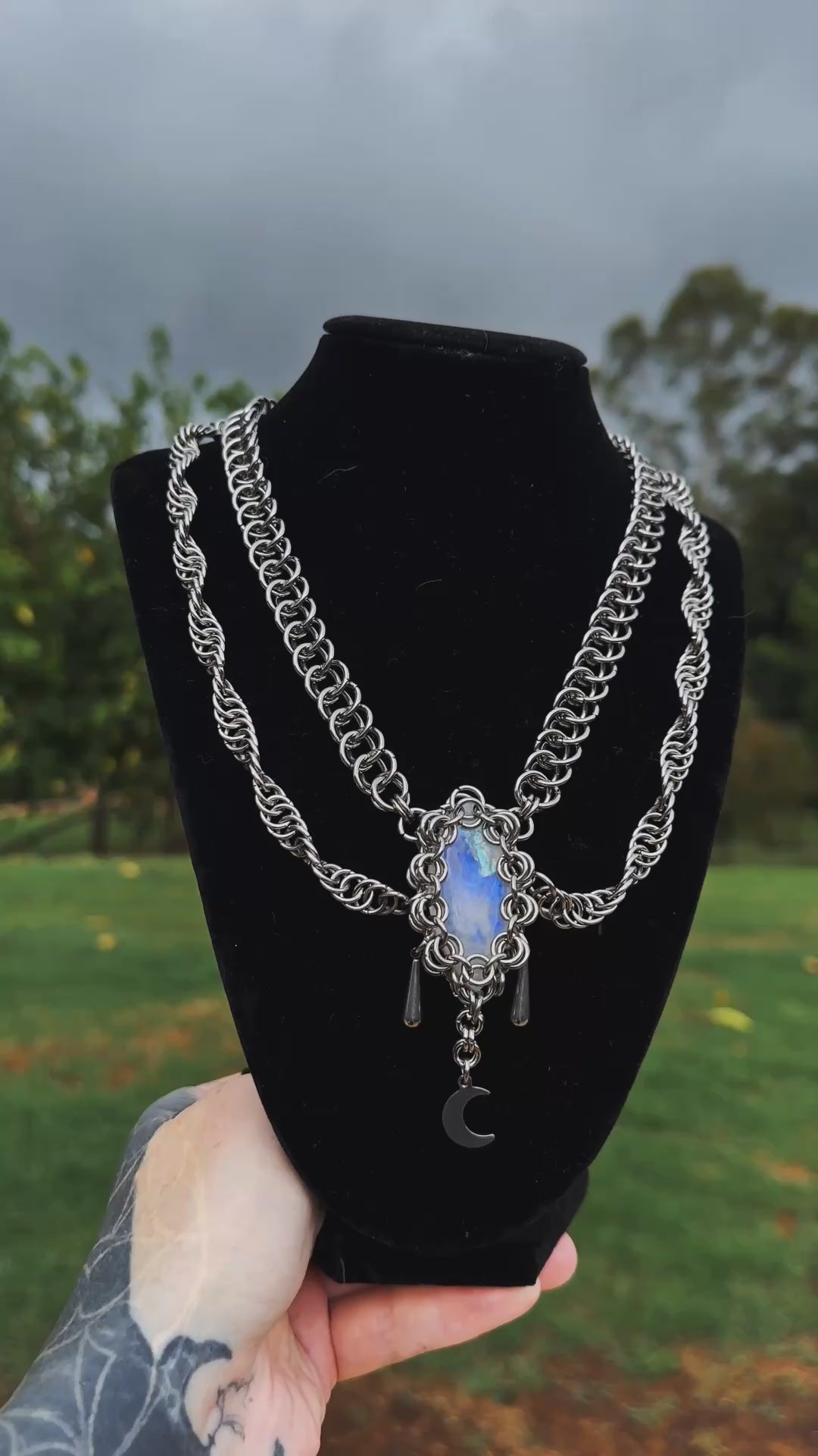 Features a breathtaking Marquise Moonstone, wrapped in chainmaille and dripped in Clair De Lune.